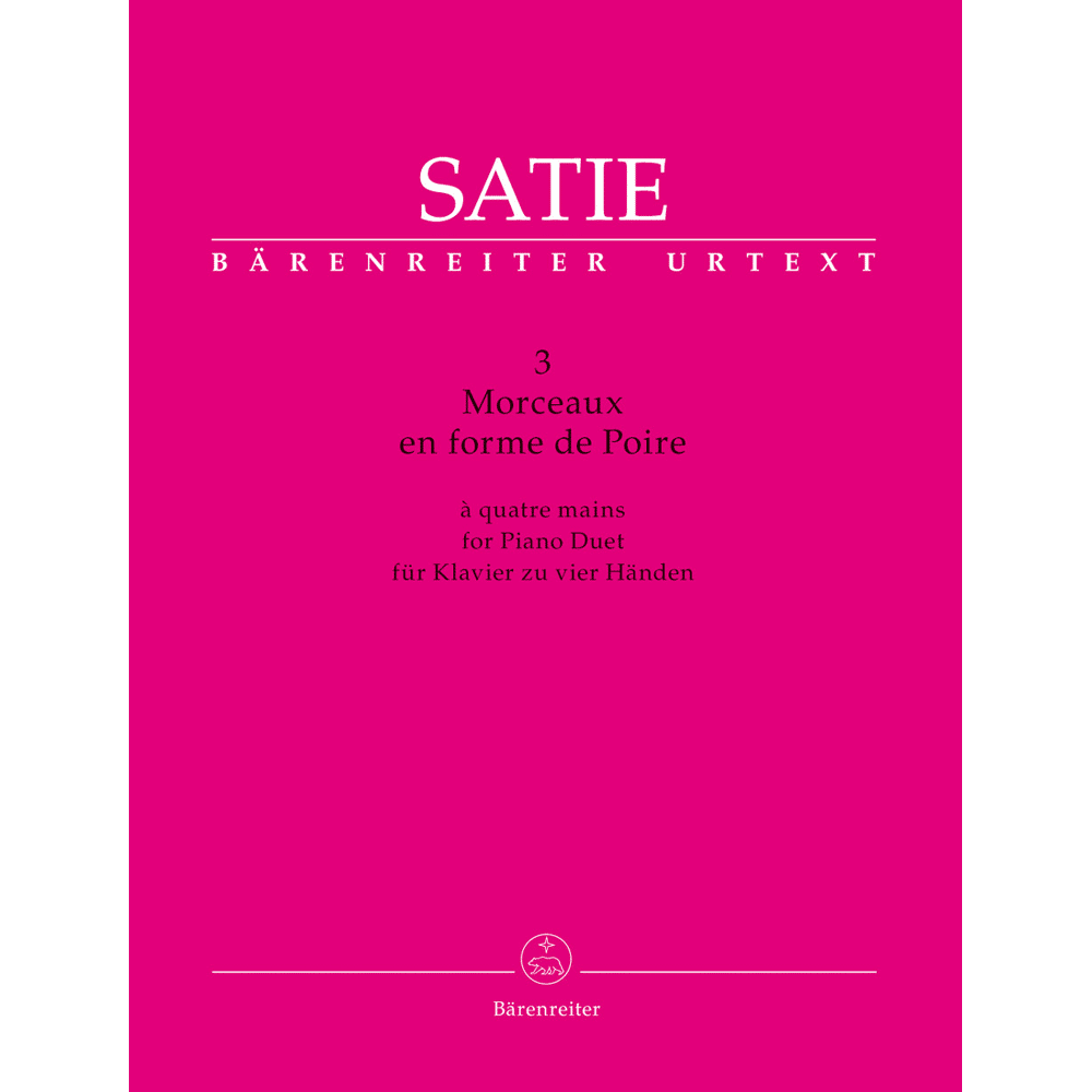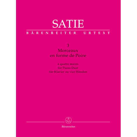 In 1903, Satie composed his famous cycle for piano duet with the provocative and ambiguous title “3 Morceaux en forme de Poire”. (In French, “poire” means “pear” but also “dimwit”). It is a detached and ironic commentary on the constraints of musical form. Now this cycle is being published in a scholarly-critical Urtext edition for the first time. Convenient page turns, a score format, translations of the French expression and tempo markings, Satie’s enigmatic introduction, performance suggestions by the Satie specialist Steffen Schleiermacher and a detailed foreword by the renowned musicologist Jens Rosteck make the study and performance of these pieces a true pleasure.