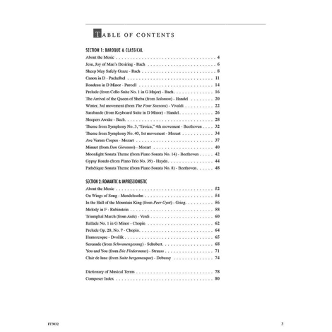 In this inspiring collection, late-elementary to early-intermediate pianists will find appealing arrangements that advance skills while exploring masterworks of Western music. The famous orchestral, keyboard, and operatic repertoire here spans four periods of music history. In the Baroque & Classical section, discover the elegance of Bach, the beauty of Mozart and the passion of Beethoven. Through the pages of the Romantic & Impressionistic section, sample the lyricism of Chopin, the drama of Grieg, and the atmosphere of Debussy. May the melodies of these and many other composers open an enduring world of expression and sound.