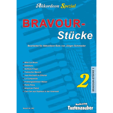 Die Bravour-Stücke gehören zu der Reihe "Akkordeon Spezial". Der zweite Band beinhaltet 10 bekannte Stücke für Akkordeon-Solo. Jürgen Schmieder hat hier eine Sammlung mit neuen Bearbeitungen der beliebten Titel geschrieben.