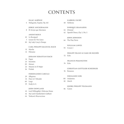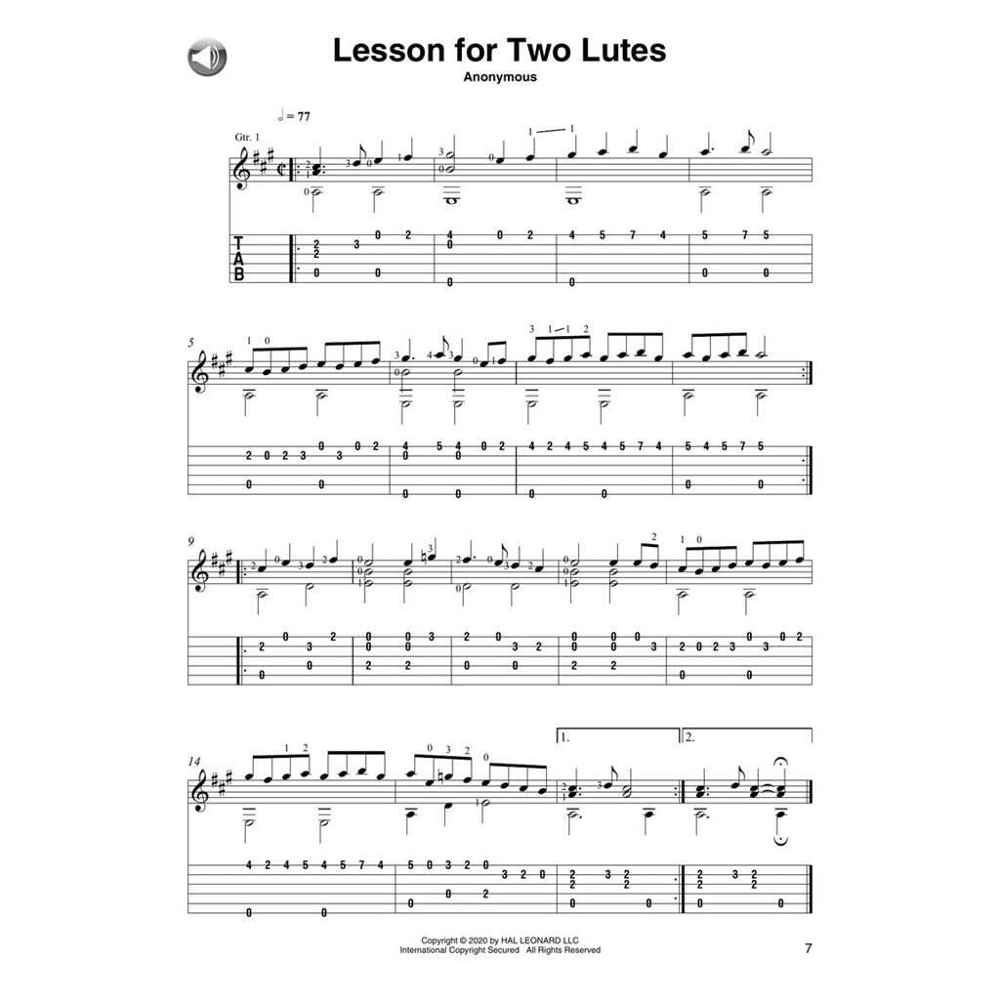 This collection of 30 masterfully crafted duets is presented with a full score in standard notation and separate parts for each guitar in its own booklet, written in standard notation and tab. Essential fingerings are included throughout. The online audio includes 90 tracks: stereo mixed of each duet, plus individual guitar parts for all 30 arrangements performed by renowned classical guitarists Edward Flower and David McLellan. Pieces include: Andantino (Sor) · Canon (Telemann)· Duet in F (Rondo) (Carulli) · Fugue (J.S. Bach) · Lesson for Two Lutes (Anonymous) · Lord Willoughby's Welcome Home (Dowland) · Malaguena, Espana, Op. 165 (Albéniz) · Oriental (Granados) · Polonaise (C.P.E. Bach) · and more. Audio is accessed online using the unique code inside the book and can be streamed or downloaded. The audio files include PLAYBACK+, a multi-functional audio player that allows you to slow down audio without changing pitch, set loop points, change keys, and pan left or right.