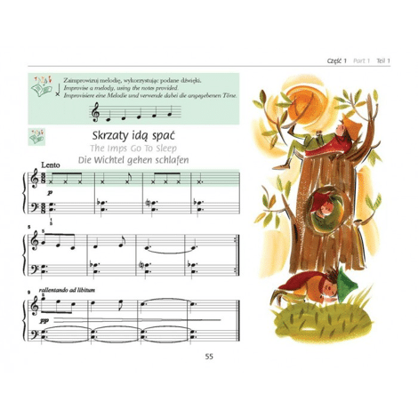 The handbook has been prepared for children beginning their education at the age of 5 or 6 years. The contents are divided into four parts. The first contains duets for student and teacher prepared using a no-score approach as well as simple compositions with scores, many of them songs, whose simple texts will serve to acquaint the student with new topics and facilitate their memorisation. The second part is devoted to teaching legato performance and practising independent hand coordination; dyads and three-note chord are introduced. Part three is a collection of recapitulative compositions in which techniques introduced previously reappear in a more advanced form. The last part is a selection of didactic miniatures by composers from various epochs. The majority of the compositions in the publication were composed by the handbook's author, who diversified them in terms of expression (waltzes, marches, polkas, and lullabies) and gave them an illustrative character so that they will easily inspire a child's imagination. Delicate dissonant harmonies resound in many of the compositions. The handbook applies a method consisting of the child playing a duet with the teacher; there are also sight-reading exercises and improvisations. Moreover, the publication contains a list of basic scales and a musical mini-dictionary.