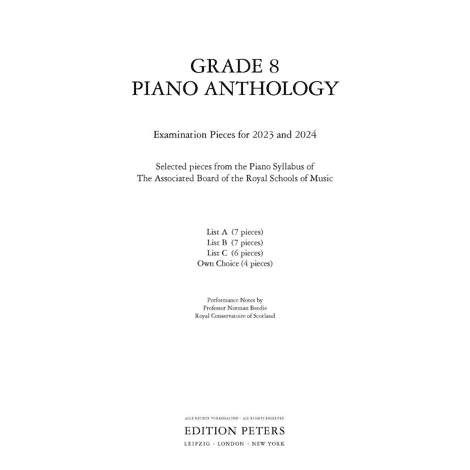 The Edition Peters Grade 8 Piano Anthology has long been a popular resource for anyone approaching this important milestone examination. In September 2022 Edition Peters will release a new Grade 8 Anthology to support the new (2023/2024) Syllabus and, for the first time, will issue new anthologies to support pianists studying at or preparing for Grades 5, 6 and 7. Also new for this year: a selection of lesser-known additional repertoire suitable for the own-choice piece in the new Performance Exams. The four new Piano Anthologies for Grades 5, 6, 7 and 8 2023/2024 comprise a broad selection of examination pieces from lists A, B and C of the Associated Board syllabus. The anthologies support students preparing for the Practical Exam or for the new Performance Exam. Those preparing for the Performance Exams are aided by Performance Notes by Norman Beedie (Lecturer in Classical Improvisation, Piano and Conducting at the Royal Conservatoire of Scotland), which give advice on technique and interpretation for each piece, and guidance on preparing an effective programme. The pieces in this volume are drawn from the extensive range of piano music in the Edition Peters catalogue – one of the widest available. With candidates able to offer a free choice work in the Performance Exam, each Anthology contains additional lesser-known repertoire suitable for the exam.