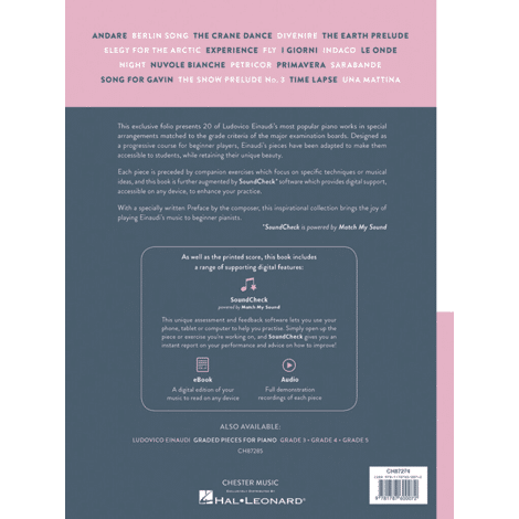 This exclusive folio presents 20 of Ludovico Einaudi ’s most popular piano works in special arrangements matched to the grade criteria of the major examination boards. Designed as a progressive course for beginner players, Einaudi ’s pieces have been adapted to make them accessible to students, while retaining their unique beauty. Each piece is preceded by companion exercises which focus on specific techniques or musical ideas, and this book is further augmented by SoundCheck* software which provides digital support, accessible on any device, to enhance your practice. With a specially written Preface by the composer, this inspirational collection brings the joy ofplaying Einaudi ’s music to beginner pianists.