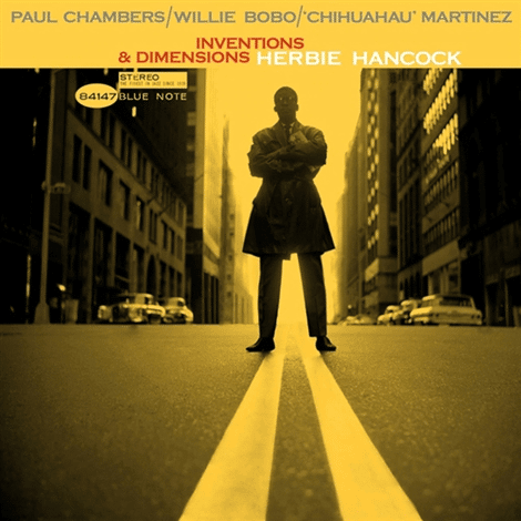 For his third Blue Note album Inventions & Dimensions (1963), pianist Herbie Hancock began moving away from the modernist hard bop sound that defined his first two albums Takin' Off and My Point Of View. Inspired by explorers like Eric Dolphy and Tony Williams, Hancock went in search of greater musical freedom by composing a set of ingenious originals each with their own unique inner logic that did away with what he considered the established jazz "assumptions" of the time. Hancock also pared the instrumentation down to feature his piano with Paul Chambers' bass and a nuanced rhythmic bed laid down by percussionists Willie Bobo and Osvaldo "Chihuahau" Martinez. On the album's unforgettable cover the designer Reid Miles lets Francis Wolff's imposing photo of Hancock on a NYC street do all the talking.