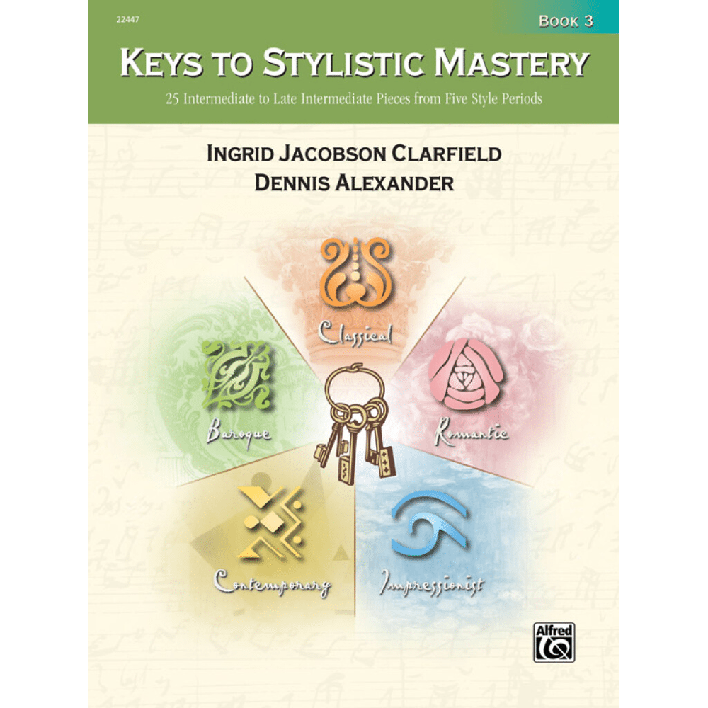 Keys to Stylistic Mastery teaches the basic principles of the five stylistic periods (Baroque, Classical, Romantic, Impressionist and Contemporary) to piano students. The pieces were chosen to provide a helpful transition frommethod books to the classics. Composer Dennis Alexander has written at least one piece in the style of each period. Information about each style period, listing selected composers, keyboard instruments and typical forms, precedesthe music from that period. Brief biographies of all composers represented are included.