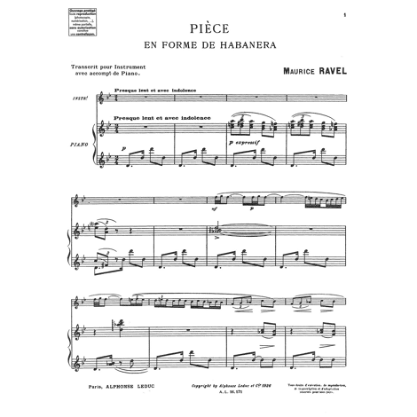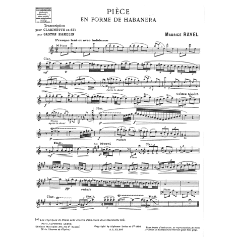 Pièce en forme de Habanera" is a piece written in 1907 by composer Maurice Ravel for vocals (bass voice) and piano. For this edition, the piece was arranged for Bb clarinet and piano. The piece is inspired by Cuban contradanza and features a characteristic habanero rhythm. Its combination of technical difficulty and expressive depth make it a favorite among clarinetists, and it is an excellent addition to a concert or recital program.