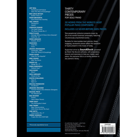 This exceptional collection presents music by 24 of the world's foremost composers, featuring 13 previously unpublished scores. Suitable for intermediate-level pianists, these engaging, accessible pieces reflect the spectrum of styles present in the music of today. Supported online by SoundCheck (powered by Match My Sound) software, with preparatory lessons and excersises to help you master each piece, this exclusive folio is a worthy addition to any pianist's library.